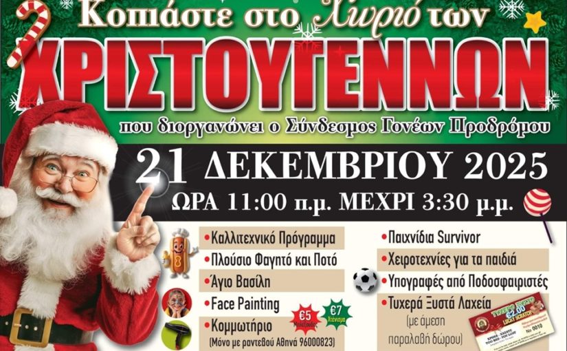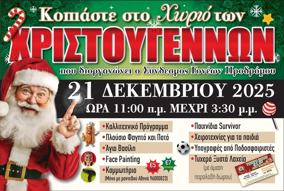 Ο Σύνδεσμος Γονέων και Κηδεμόνων Προδρόμου ανακοινώνει με χαρά τη μεγάλη χριστουγεννιάτικη εκδήλωση «Το Χωριό των Χριστουγέννων», που θα πραγματοποιηθεί το Σάββατο 21 Δεκεμβρίου 2025, από τις 11:00 π.μ. έως τις 15:30 μ.μ., στο Δημοτικό Σχολείο Προδρόμου Λάρνακας.