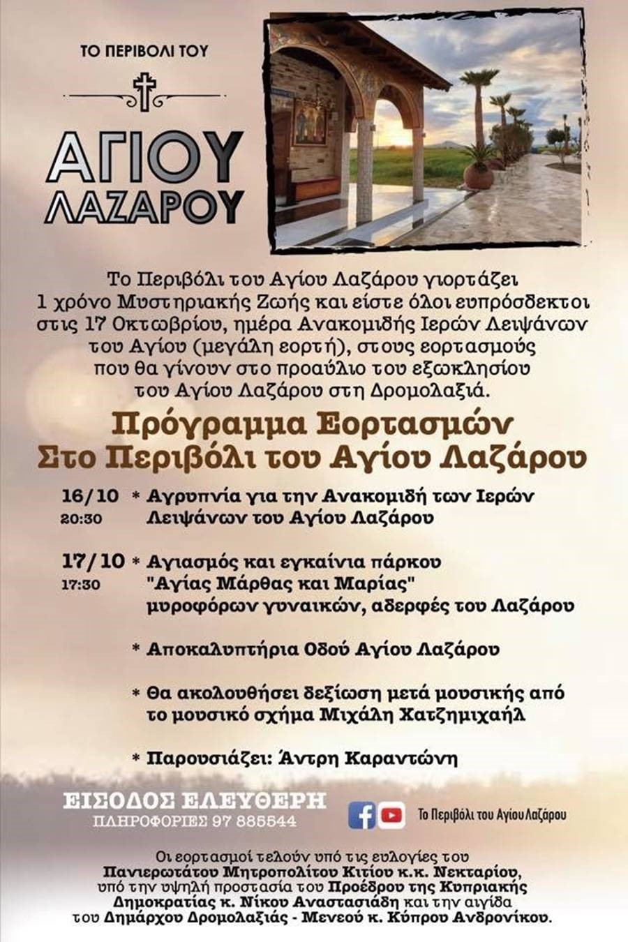 Το Περιβόλι του Αγίου Λαζάρου γιορτάζει 1 χρόνο Μυστηριακής Ζωής και είστε όλοι ευπρόσδεκτοι στις 17 Οκτωμβρίου, ημέρα Ανακομιδής Ιερών Λειψάνων του Αγίου (μεγάλη εορτή ) στους εορτασμούς που θα γίνουν στο προαύλιο του εξωκλησίου του Αγίου Λαζάρου στη Δρομολαξιά.