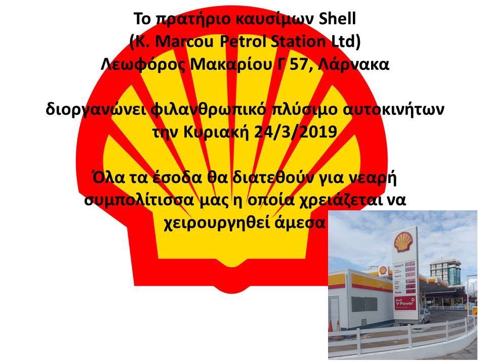 Το πρατήριο καυσίμων Shell  (K. Marcou Petrol Station Ltd) Λεωφόρος Μακαρίου Γ 57, Λάρνακα διοργανώνει φιλανθρωπικό πλύσιμο αυτοκινήτων την Κυριακή ,24/3/2019.