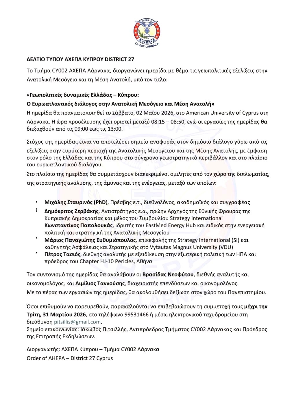 Σημείο επικοινωνίας: Ιάκωβος Πιτσιλλής, Αντιπρόεδρος Τμήματος CY002 Λάρνακας και Πρόεδρος της Επιτροπής Εκδηλώσεων.