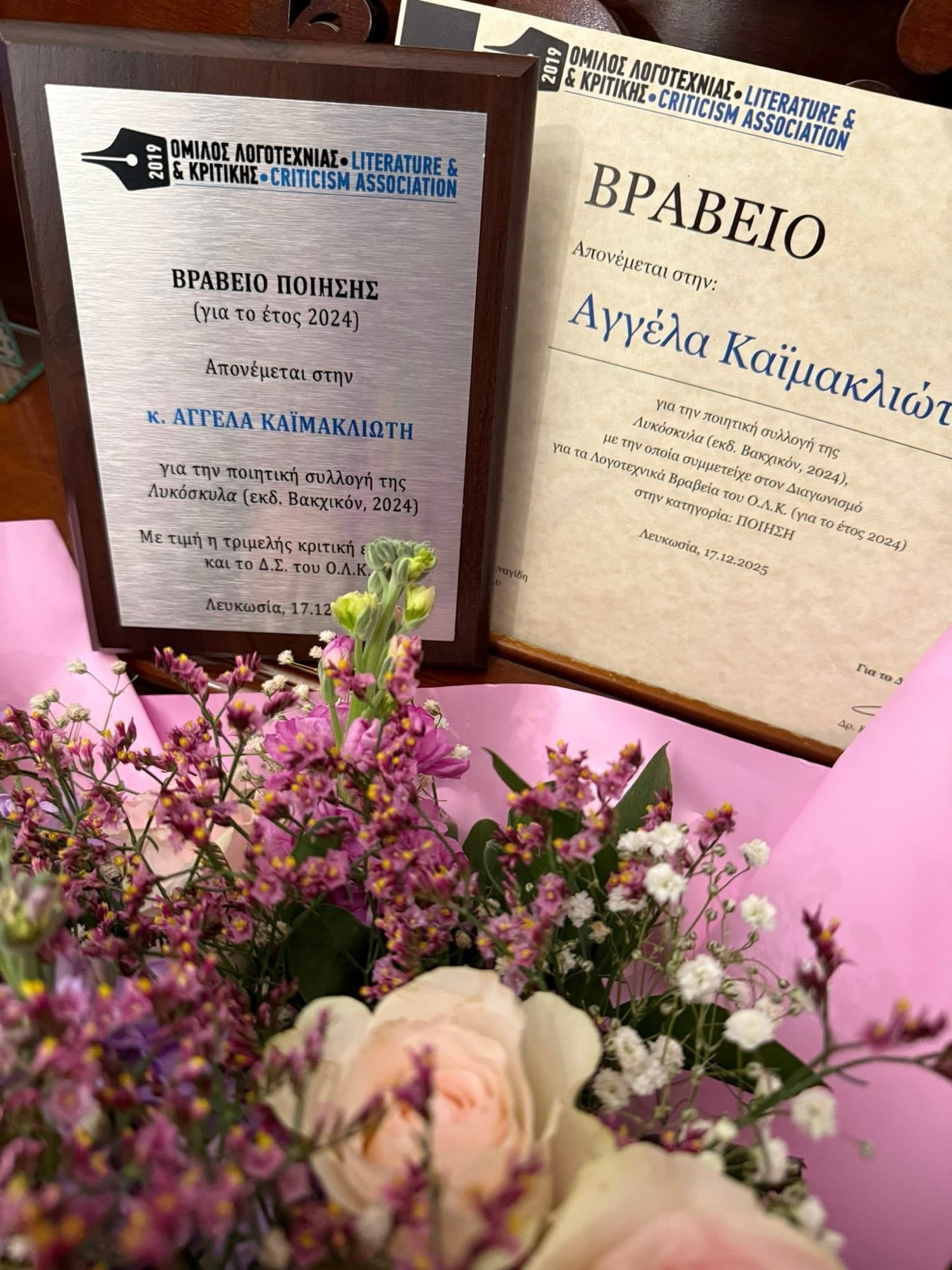 Το Βραβείο Ποίησης Ο.Λ.Κ 2025 απονεμήθηκε στη συμπολίτισσα μας Αγγέλα Καϊμακλιώτη για το βιβλίο της Λυκόσκυλα, Βακχικόν, 2024.