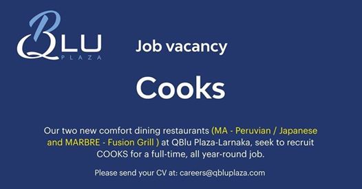 Our two new comfort dining restaurants (MA – Peruvian / Japanese and MARBRE – Fusion Grill ) at QBlu Plaza-Larnaka, seek to recruit COOKS for a full-time, all year-round job.