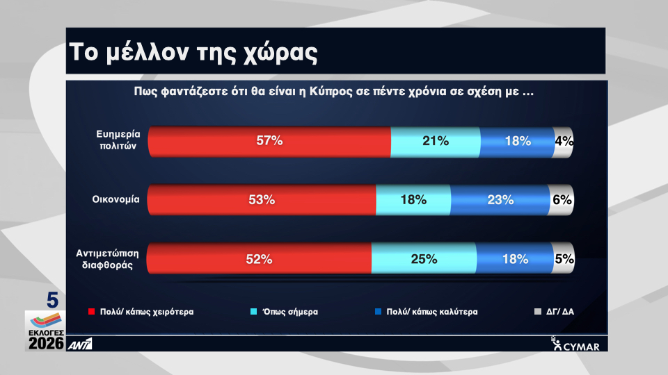 Η έρευνα κάλυψε και τις απόψεις των πολιτών, πώς φαντάζονται ότι θα είναι η Κύπρος σε πέντε χρόνια, σε σχέση με μία σειρά ζητήματα.