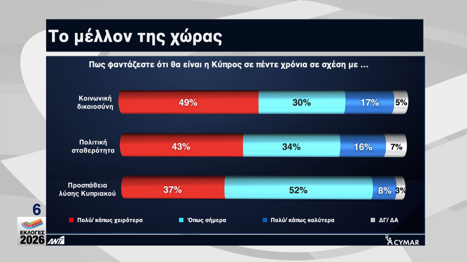 Ποσοστό 49% φαντάζεται πολύ ή κάπως χειρότερα τα πράγματα σε σχέση με την κοινωνική δικαιοσύνη και 43% σε σχέση με την πολιτική σταθερότητα της χώρας. Ενώ σε σχέση με την προσπάθεια λύσης του Κυπριακού 52% θεωρεί ότι η κατάσταση θα είναι σε πέντε χρόνια όπως είναι σήμερα, 37% αναμένει ότι θα είναι πολύ ή κάπως χειρότερη και μόλις 8% αισιοδοξεί ότι θα είναι πολύ ή κάπως καλύτερη.
