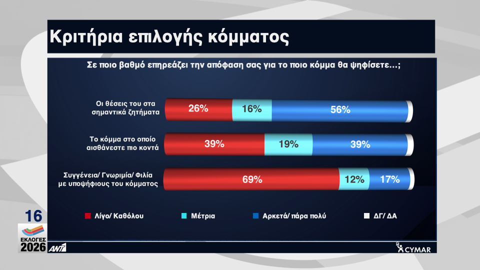 Σε σχέση με τα όσα επηρεάζουν την απόφασή τους για το κόμμα που θα ψηφίσουν, 56% απαντά οι θέσεις του κόμματος στα σημαντικά ζητήματα ενώ 69% απορρίπτει ότι επηρεάζεται από συγγένεια, γνωριμία ή φιλία με υποψήφιους του κόμματος.