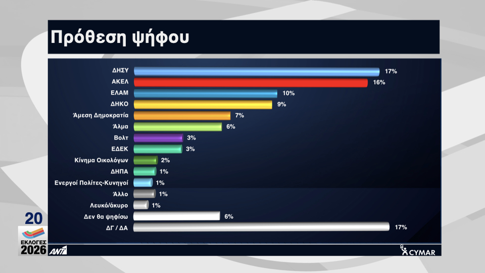 Και στις δύο ερωτήσεις, 4% απάντησε ότι θα ψηφίσει μόνο κόμμα και 5% ότι δεν θα ψηφίσει.