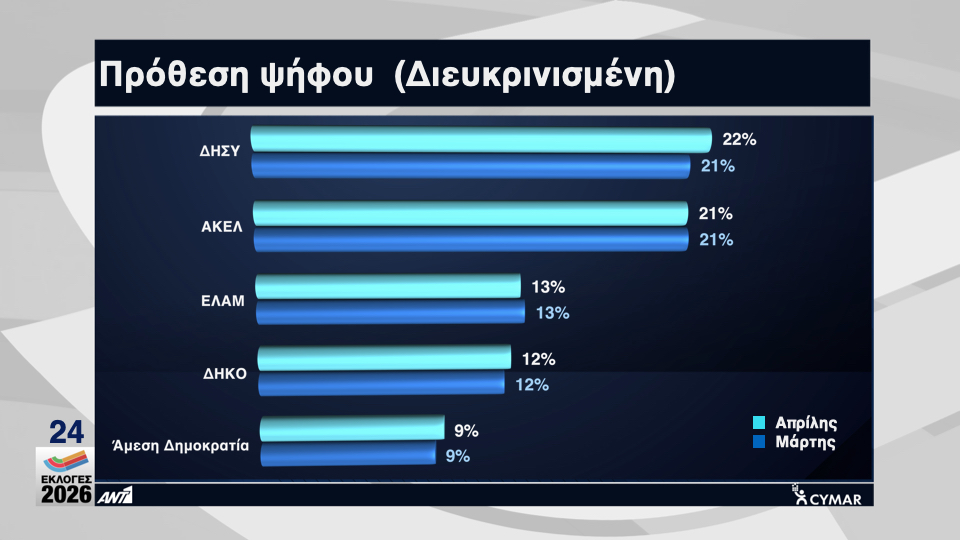 ΔΗΣΥ 22%, ΑΚΕΛ 21%, ΕΛΑΜ 13%, ΔΗΚΟ 12%, Άμεση Δημοκρατία 9% Άλμα 8%, Βολτ και ΕΔΕΚ από 4%.