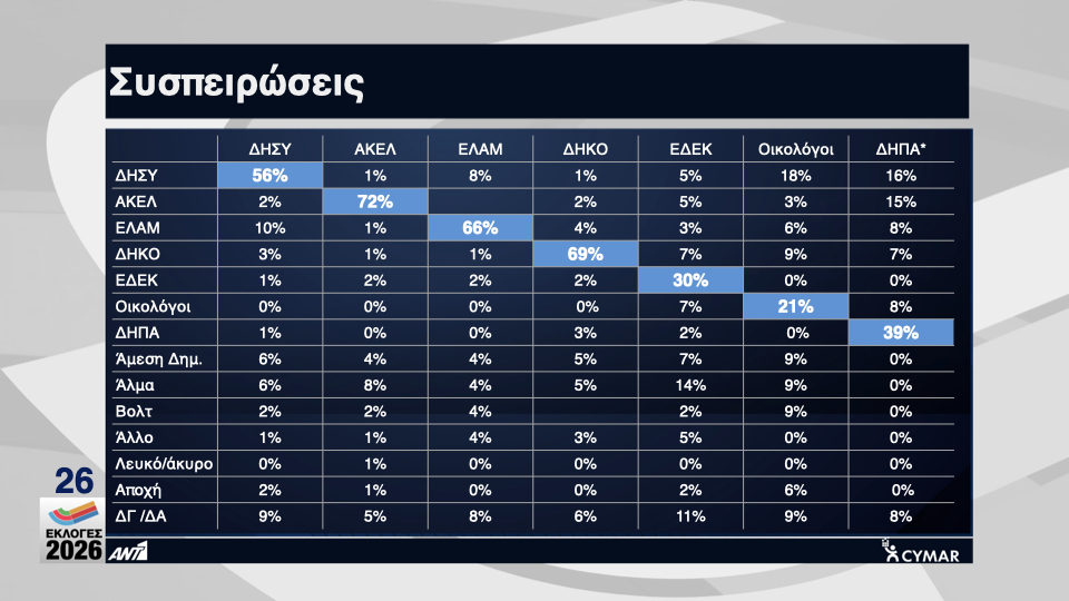 Τη μεγαλύτερη συσπείρωση καταγράφει το ΑΚΕΛ με 72%, αύξηση στη συσπείρωσή του καταγράφει το ΔΗΚΟ με 69% και πτώση το ΕΛΑΜ με 66% ενώ ακολουθεί ο ΔΗΣΥ με 56%.