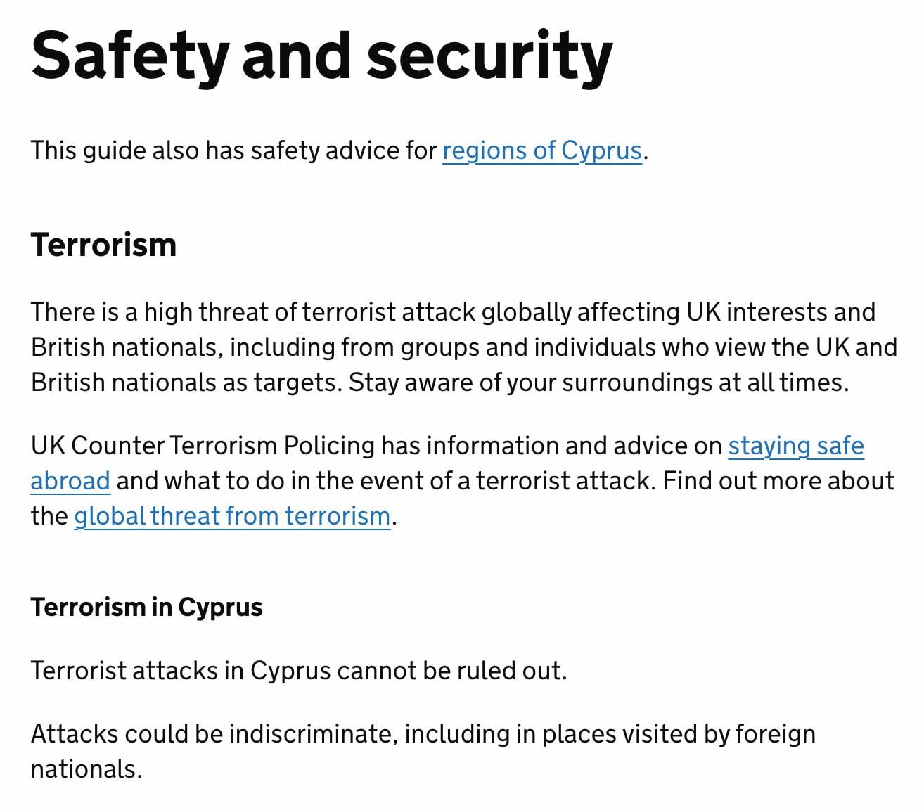 Το Ηνωμένο Βασίλειο προειδοποιεί για πιθανή τρομοκρατική απειλή στην Κύπρο, επισημαίνοντας ότι επιθέσεις δεν μπορούν να αποκλειστούν και καλώντας τους πολίτες του να παραμένουν σε αυξημένη επαγρύπνηση.