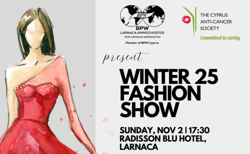 Η Οργάνωση Επαγγελματιών και Επιχειρηματιών Γυναικών Λάρνακας – Αμμοχώστου BPW Larnaca Ammochostos, μέλος της BPW Cyprus, σε συνεργασία με τον Αντικαρκινικό Σύνδεσμο Κύπρου, παρουσιάζουν το Winter 25 Fashion Show, την Κυριακή, 2 Νοεμβρίου 2025, στις 17:30, στο Radisson Blu Hotel, στη Λάρνακα.