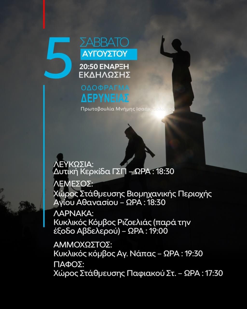 Το Σάββατο θα ενωθούν όλοι στο οδόφραγμα της Δερύνειας όπου θα γίνει εκδήλωση μνήμης, τιμής και αξιοπρέπειας, όπως ανέφερε.