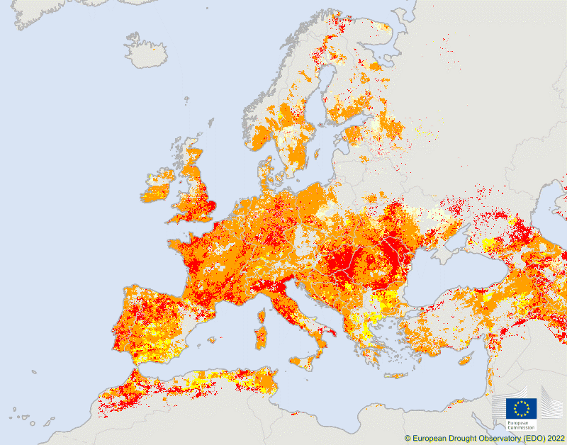 Η κατάσταση ξηρασίας σε πολλές περιοχές της Ευρώπης παραμένει σοβαρή, σύμφωνα με την τελευταία έκθεση του Κοινού Κέντρου Ερευνών (ΚΚΕρ) της Επιτροπής με τίτλο «Drought in Europe — August 2022», μια επικαιροποιημένη αξιολόγηση της κατάστασης ξηρασίας στην Ευρώπη με βάση τα δεδομένα και τις αναλύσεις του ευρωπαϊκού παρατηρητηρίου για την ξηρασία. Η εξέλιξη και οι επιπτώσεις της παρατεταμένης ξηρασίας στην ΕΕ επιβεβαιώνουν την ανησυχητική κατάσταση του φετινού Ιουλίου: το 47 % της ΕΕ εξακολουθεί να βρίσκεται σε επίπεδο προειδοποίησης, που σημαίνει ότι οι βροχοπτώσεις είναι χαμηλότερες από ό,τι συνήθως και η υγρασία του εδάφους είναι μειωμένη, ενώ το 17 % της ΕΕ βρίσκεται σε επιφυλακή, που σημαίνει ότι η βλάστηση και οι καλλιέργειες εμφανίζουν τις αρνητικές επιπτώσεις της ξηρασίας. Συνολικά, το 64 % της Ευρώπης βρίσκεται σε επίπεδο προειδοποίησης ή επιφυλακής, γεγονός που συμβάλλει επίσης στην ευρεία εξάπλωση των περιοχών που αντιμετωπίζουν κίνδυνο πυρκαγιάς σε ολόκληρη την ΕΕ.